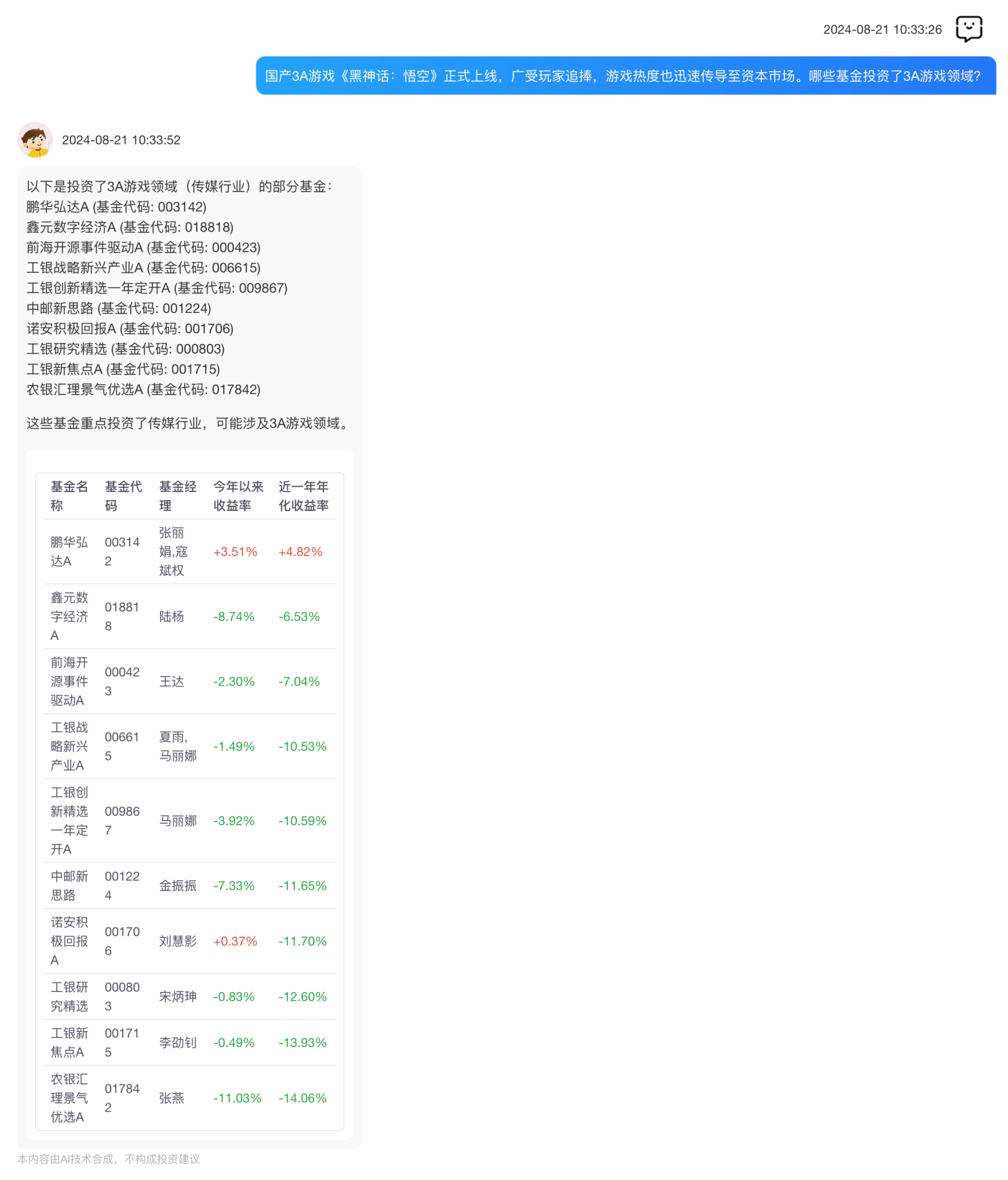 8月21日,有用户使用“基金通”专业版提问:哪些基金投资了3A游戏领域?