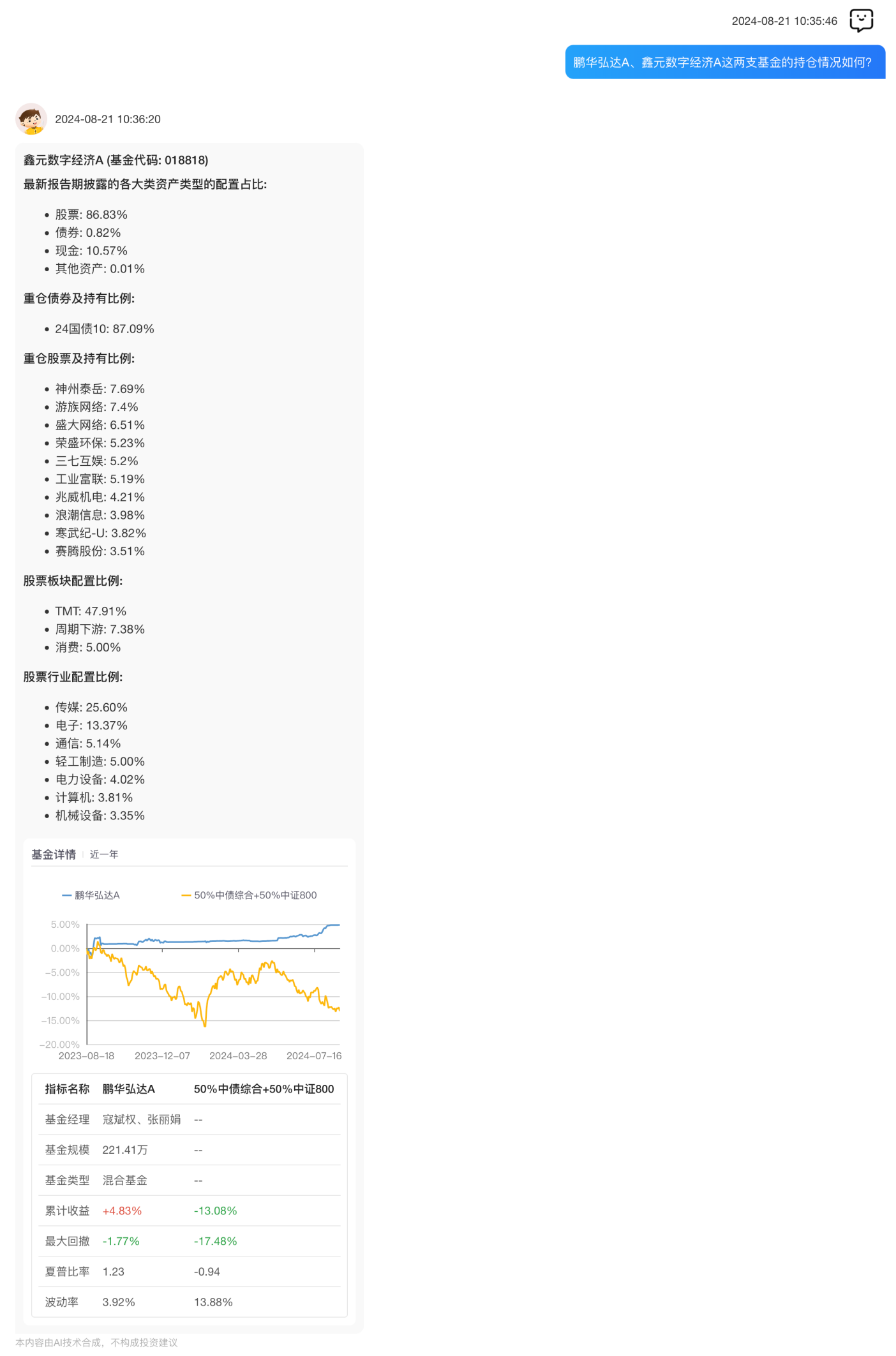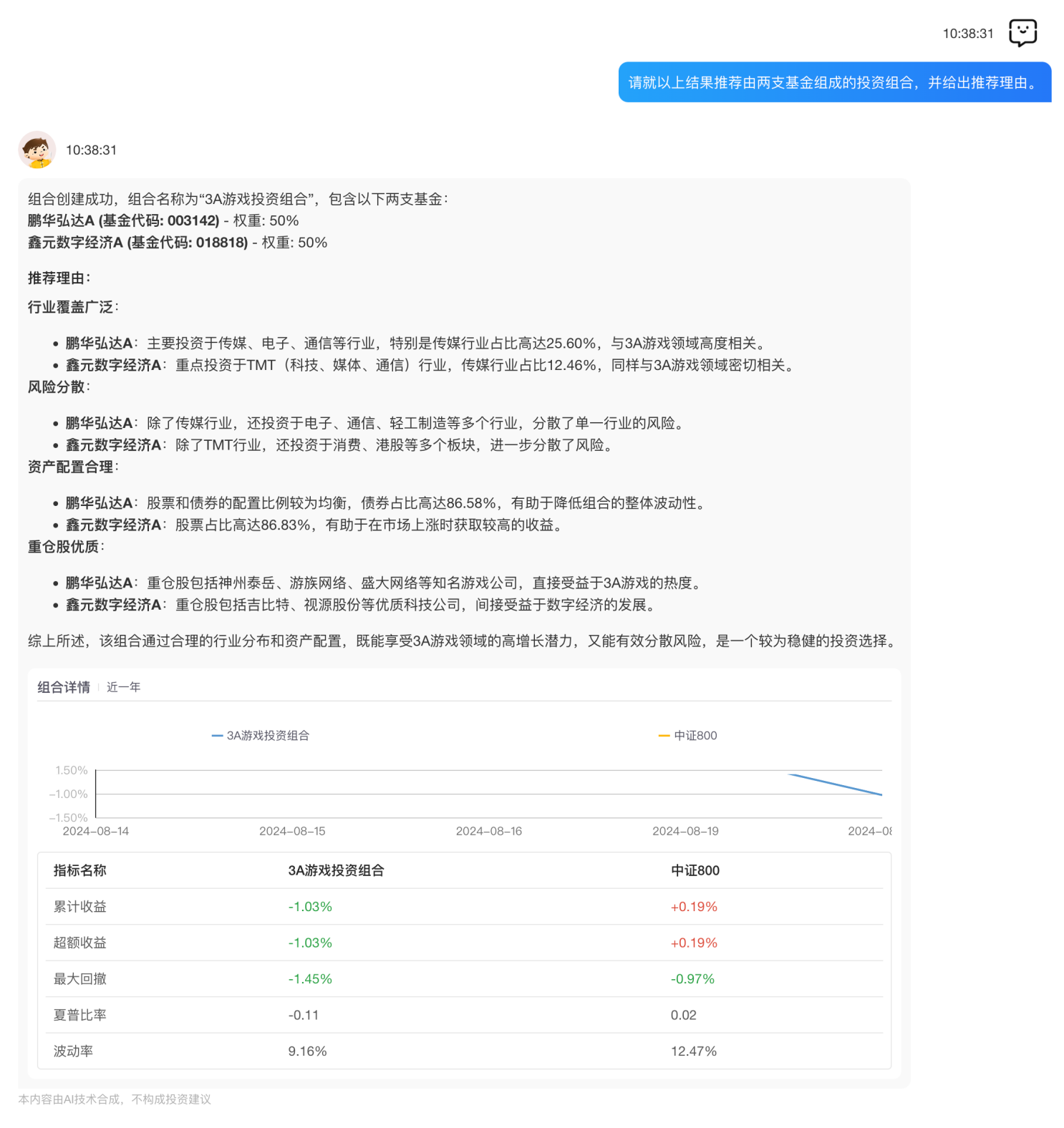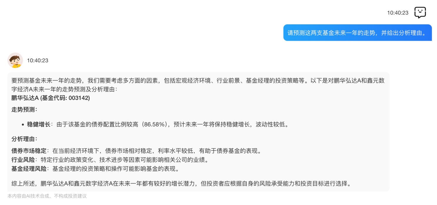 最后,用户希望“基金通”预测两支基金未来的走势情况,并给出理由。“基金通”专业版本着优化收益、分散风险的目标,给出了走势分析和投资建议,供用户做投资参考。